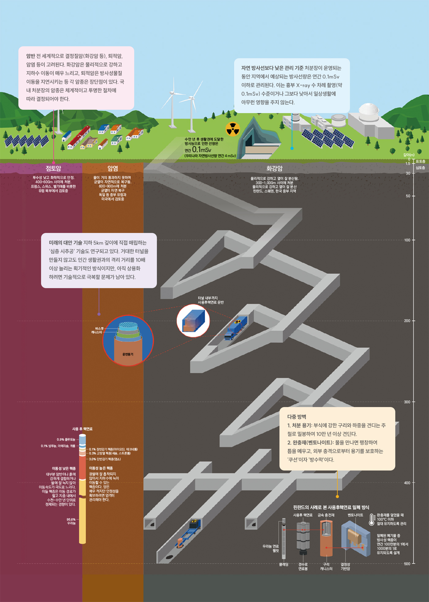 - 영구처분의 핵심 개념은 방사성 물질의 이동 가능성을 단계적으로 차단하는 다중 방벽 체계다. 첫 단계에서는 핵연료 자체가 고체 상태를 유지하며 방사성 물질의 확산을 억제한다. 다음으로 부식 저항성이 높은 구리 용기를 두어 방사능의 누설을 장기간 차단한다. 이 용기 주변에는 벤토나이트 점토를 채워 지하수 유입과 물질 이동을 제한한다. 마지막으로 수억 년 동안 안정성을 유지해 온 암반층이 천연방벽 역할을 한다. 이 여러 단계의 방어는 개별 요소에 문제가 생기더라도 전체 안전성이 유지되도록 설계된 것이다.