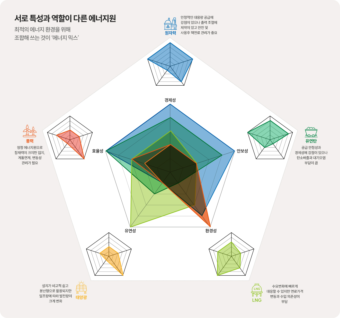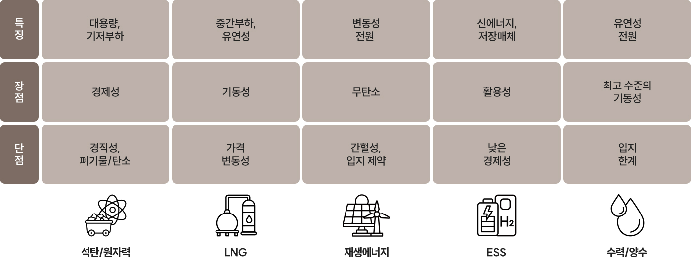 따라서 '어떤 에너지원을 사용할 것인가'라는 질문보다 '각각의 장점은 취하고 단점을 보완하려면 다양한 에너지원을 어떻게 조합할 것인가', 즉 최적의 조합인 '에너지 믹스(Energy Mix)'를 만드는 일이다. - 인포그래픽에서 다룬 주요 5대 핵심 전원을 살펴보면 그 역할이 명확히 갈린다. 원자력과 유연탄은 경제성과 공급안정성 측면에서 뛰어나 전력망의 뼈대가 되는 기저전원 역할을 하지만, 원전을 출력 조절이 어렵고 유연탄은 환경 부담이 큰 편이다. 반면 LNG는 수요 변화에 빠르게 대응할 수 있어 유연성이 크지만 연료 가격이 급격히 변하는 편이고 전량 수입에 의존하고 있다.