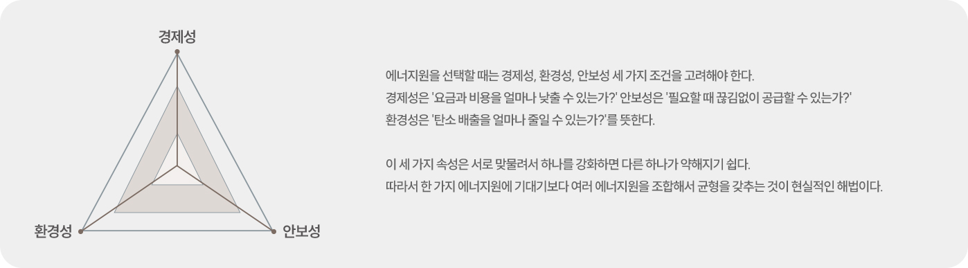 에너지에서는 경제성(저렴한 비용), 안보성(안정적 공급), 환경성(탄소 배출 저감)의 세 조건이 충돌한다. 이 세 조건을 모두 완벽하게 만족하는 '만능' 에너지원은 현실에 존재하지 않는다.