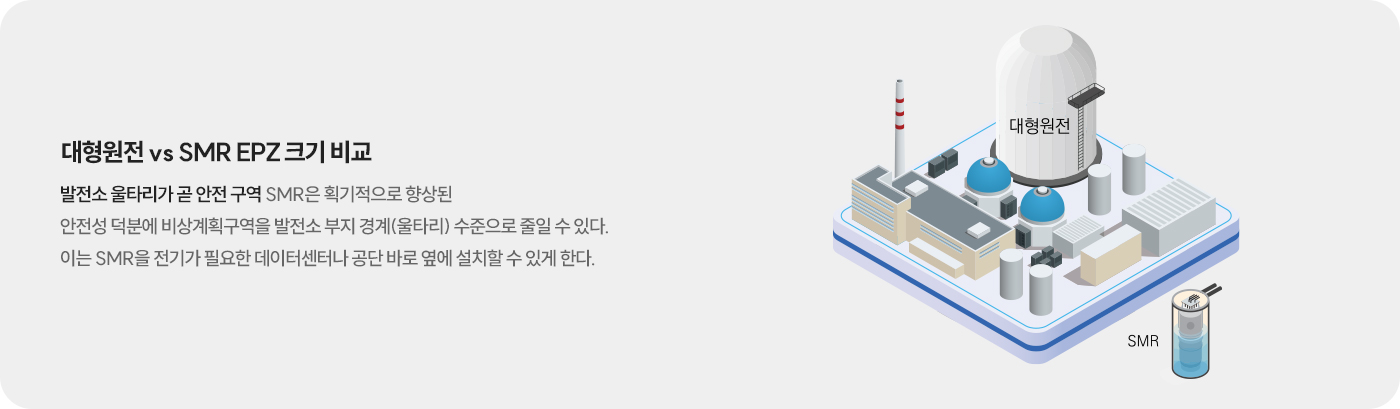 - 이러한 특성을 바탕으로 미국 원자력규제위원회 등 주요 규제 기관들은 소형모듈원전의 EPZ를 기존 대형 원전보다 줄이는 방안을 검토하고 있다. 발전소 부지 경계, 즉 수백 미터 수준까지 축소하거나 현재의 수 킬로미터 이내로 설정하는 것이 기술적으로 가능하다는 판단이다. 이는 원전이 도심 인근이나 산업단지 내부에 위치해 전력을 직접 공급할 수 있는 가능성을 넓히며, 전력 공급의 입지와 방식에 변화를 가져올 수 있다.