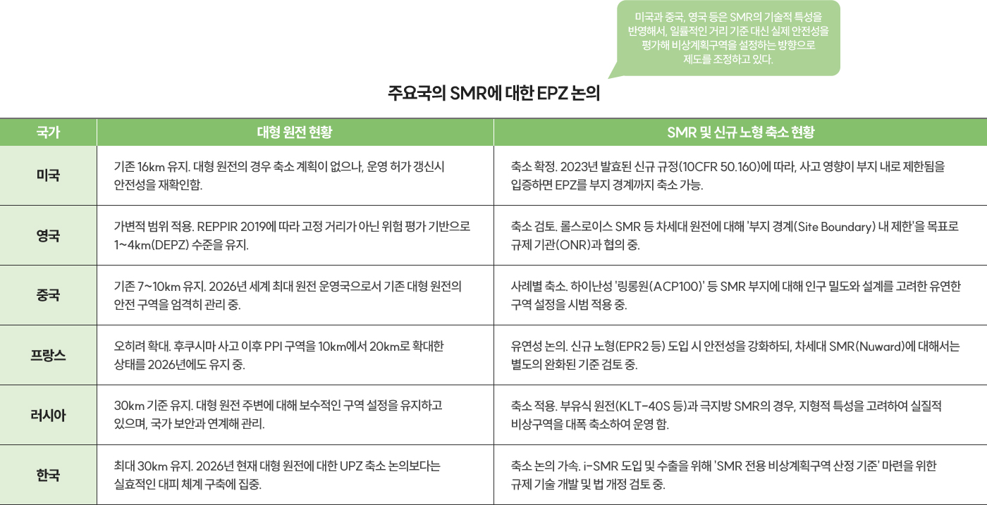 - 최근 소형모듈원전의 등장은 EPZ 기준을 다시 검토하는 계기가 되고 있다. 소형모듈원전은 대형 원전에 비해 열출력이 약 10% 수준으로 작고, 원자로 내부에 존재하는 방사성 물질의 총량도 상대적으로 적다. 여기에 펌프나 외부 전원에 의존하지 않고 자연 대류와 중력만으로 원자로를 식히는 피동형 냉각 계통을 적용해, 전원 상실 상황에서도 노심 손상으로 이어질 가능성이 크게 낮다.