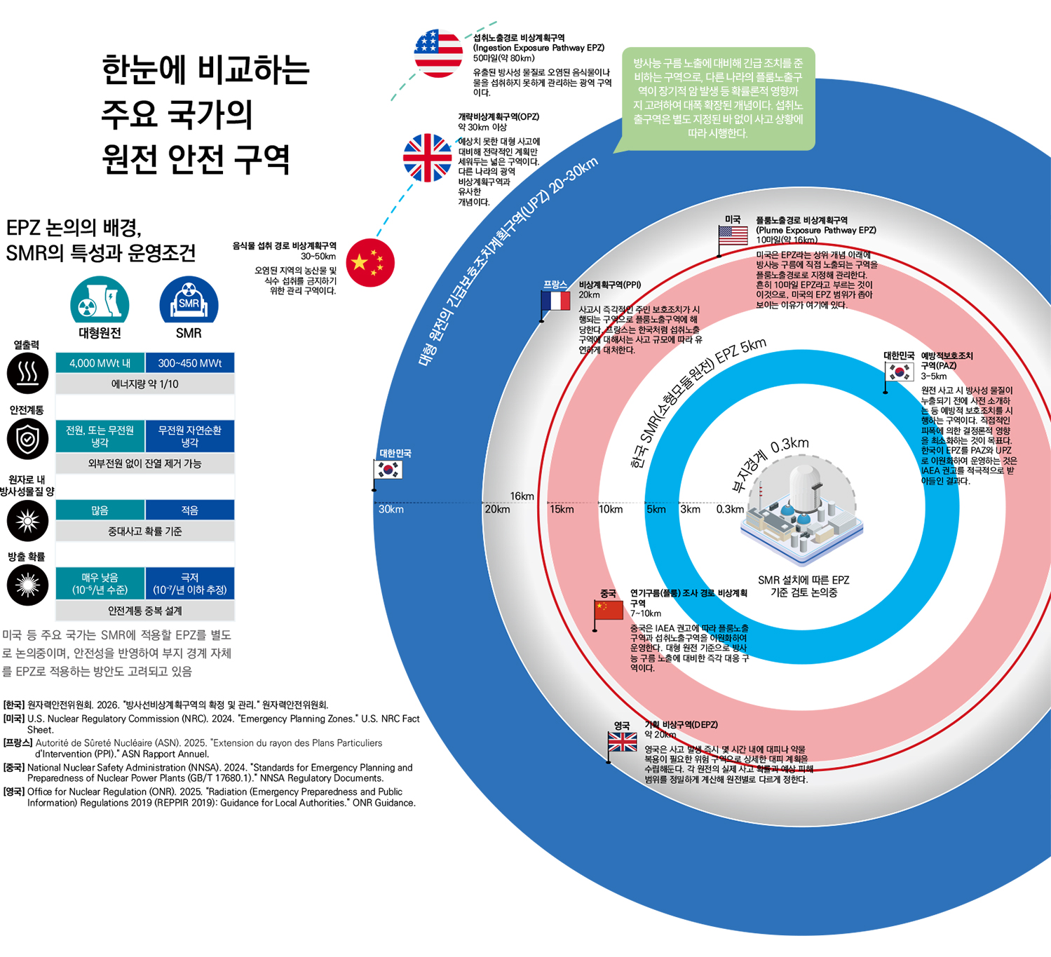 - 원전의 안전 기술과 비상대응 체계는 각국의 여건에 맞춰 발전했다. 이에 따라 비상계획구역 기준도 함께 조정됐다. 각국은 사고 시 예상되는 방사선 영향과 중대사고 가능성, 주민 대피에 필요한 시간을 종합해 EPZ를 설정한다. 이 인포그래픽은 이러한 판단 기준이 어떻게 구성되는지를 비교해 보여주며, 현재의 기술 수준과 운영 경험을 기준으로 EPZ를 이해하는 데 필요한 핵심 요소를 정리했다.